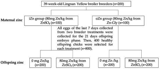 This study was approved by the Animal Care and Use Committee of Zhejiang University. Experimental design and treatments for the maternal broiler breeder phase were discussed in detail in our previous study [18]. A completely randomized design was performed with two maternal dietary supplemental Zn sources [maternal Zn–Gly (oZn) vs. maternal ZnSO4 (iZn)] × two offspring dietary supplemental Zn doses [Zn-unsupplemented control diet (CON), the control diet + 80 mg of Zn/kg of diet from ZnSO4 (80 mg zinc/kg was derived from crystal standard zinc, provided by PANCOSMA, Switzerland). Firstly, a total of 200 39-week-old Lingnan Yellow broiler breeders were randomly divided into two groups—the oZn group and iZn group—with each group containing 5 replicates with 20 birds each. All broiler breeders from the two groups were fed a corn–soybean meal basal diet with 24 mg Zn/kg for four weeks pre-test to consume excess Zn in the body; in the formal feeding period of eight weeks, the iZn group and oZn group were supplemented with 80 mg Zn/kg from ZnSO4 and 80 mg Zn/kg from the Zn–Gly-based basal diet, respectively. All eggs from the last seven days were collected from two breeder groups (oZn group and iZn group) for offspring incubation. Then, 400 healthy offspring chicks from each group were selected and divided into two groups with two offspring dietary supplemental Zn doses (0 or 80 mg Zn/kg). Figure 1 shows the entirety of the experimental design. Table 1 displays the composition and nutrient content of the basal diet for the broiler breeders. The control group received the basal diet without Zn supplementation (negative control), and (iZn-iZn) and Zn–Gly (oZn-oZn) received a basal diet supplemented with 80 mg of Zn/kg of diet from ZnSO4 and Zn–Gly, respectively. Then, all hatched chicks were reared for the 60 day offspring broiler phase. Table 2 shows the composition and nutrient level of the basal diet for the offspring broiler. On days 21 and 60, three male broilers from each replicate were randomly selected and slaughtered. Serum samples from the blood were isolated by centrifuging at 3000× g for 10 min and stored at −80 °C until analysis. Liver and left breast muscle samples were immediately stored at −80 °C after slaughter for further analysis.