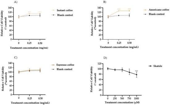 Evaluation of cell viability in HT-29 cells. The effect of treatment with different types of coffee extract: instant (A), Americano (B), and espresso (C), at 0.250 and 0.500 mg/mL on cell viability was evaluated using the MTT assay after 24 h with respect to the mock control. The MTT test was used to determine the impact of skatole treatment (D) on cell viability after 24 h at the concentrations of 250, 500, 750, and 1000 µM compared with control cells (treated only with DMSO). The graph represented the mean and SD of three separate experiments. * p-value ≤ 0.05 and *** p-value ≤ 0.001 compared to the control group (calculated as fold-change relative to control cells, arbitrarily set at 100%).