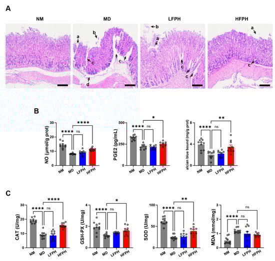 Gastric tissue sections of the ethanol-induced gastric ulcers of mice were analyzed by HE staining. The mucosal layer, glandular layer, and submucosa of the NM group were intact (Figure 2A). However, in the MD group, the gastric mucosal epithelium was largely deficient, the structure of the glandular layer was severely disordered, the submucosa was marked with edema, and inflammatory spillover was observed. Compared with the MD mice, the degree of lesions in the LFPH mice was reduced, but the epithelial tissue was still obviously deficient, and the gland’s structure was partly disordered. The HFPH treatment had a significant inhibitory effect on gastric ulcer lesions. Only mild defects in the gastric mucosal epithelium and a small area of glandular structural disorder were observed.