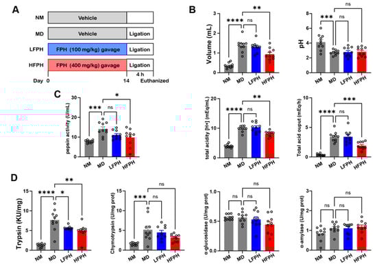 Effects of FPH on gastric acid and digestive enzyme secretion in mice with pyloric ligation-induced gastric ulcers. Protocol of the animal experiments (A). Gastric secretion parameters (B). Activity of pepsin in the gastric juice (C). Duodenal activity of digestive enzymes (D). Data are expressed as the mean ± SEM. one-way ANOVA followed by Tukey’s multiple comparison tests (n = 10) was used to analyze the significance. * p < 0.05, ** p < 0.01, *** p < 0.001, and **** p < 0.0001 represent significant differences; ns, not significant.