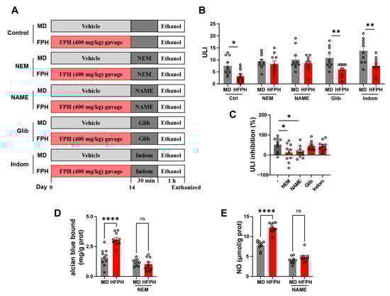 Effects of molecular pathway blockers on the gastroprotective effect of FPH. Protocol of the animal experiments (A). Ulcerative lesion index (ULI) (B). ULI inhibition (C). Mucin content in gastric tissues after the NEM treatment (D). NO content in gastric tissues after the NEM treatment (E). Data are expressed as the mean ± SEM. Two-way ANOVA followed by Bonferroni’s multiple comparison tests (n = 10) was used to test significance for (B,D,E). One-way ANOVA followed by Tukey’s multiple comparison tests (n = 10) was used to analyze the significance for (C). * p < 0.05, ** p < 0.01, and **** p < 0.0001 represent significant differences; ns, not significant.