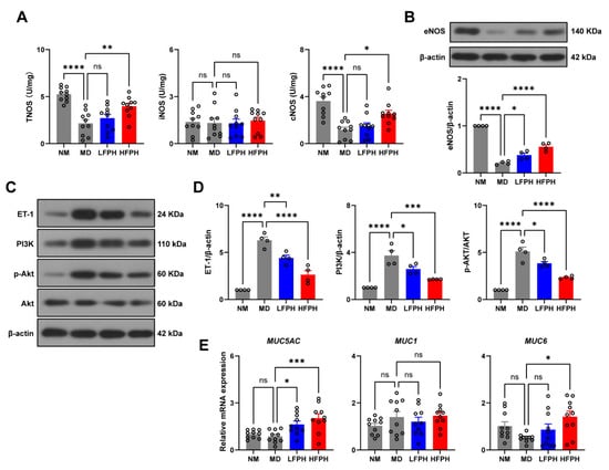 Molecular mechanisms of the gastroprotective effects of FPH on ethanol-induced gastric ulcers. Activity of NOS (A). Expression of eNOS (B). Expression of ET-1, PI3K, and Akt (C,D). mRNA expression of MUC5AC, MUC1, and MUC6 (E). Data are expressed as the mean ± SEM. One-way ANOVA followed by Tukey’s multiple comparison tests (n = 10 for (A,E); n = 4 for (B,C)) was used to analyze the significance. * p < 0.05, ** p < 0.01, *** p < 0.001, and **** p < 0.0001 represent significant differences; ns, not significant.