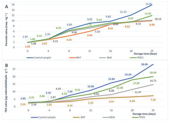 The influence of BHT, BHA, and TPEO on PVs (A) and TBA values (B) of sunflower oil samples during 24 days of storage. Values are expressed as means ± SD (n = 9).
