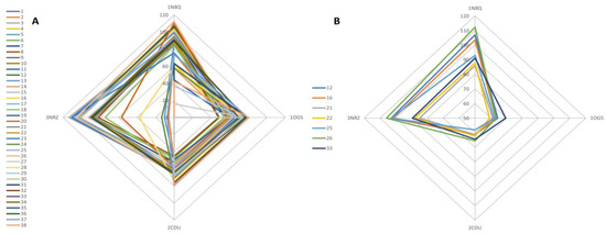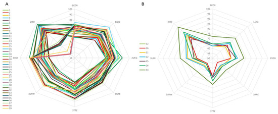 Graphical representation of the docking scores related to antioxidant protein targets, corresponding to 39 TPEO components (A) and 7 major TPEO constituents (B) (representing over 75% of the essential oil); docking scores calculated as a percentage of the native ligand’s score of each target protein; the results are plotted in the form of a radar chart where docking scores (recalculated as a percentage of the native ligand’s docking score) of each compound, represent a series and the target proteins are in the corner of the graph.