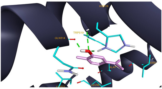 Structure of lipoxygenase (1N8Q) in complex with docked compound 26 (carvacrol) interacting with highlighted amino acids (cyan) Gln514, His518, and Trp519 through HB; hydrophobic interactions are omitted for better picture quality.
