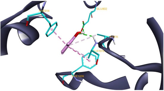 Structure of xanthine oxidase (3NRZ) in complex with docked compound 26 (carvacrol) interacting with highlighted amino acids (cyan) Glu802, Phe914, Phe1009, Ala1078 and Ala1079; HB interactions are depicted as green dotted lines and hydrophobic interactions as purple dotted lines.