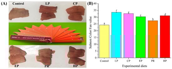 Comparison of pigmentation in the dorsal muscle of Oncorhynchus mykiss fed on an experimental diet for 56 days ((A) Visual color inspection; (B) Salmon color fan value). The color value of fresh fillet in Oncorhynchus mykiss fed on experimental diets. Values are presented as mean ± SE, n = 12. Different letters represent statistical differences (p < 0.05).