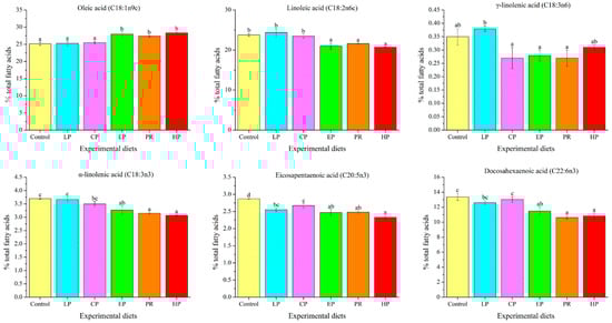 The long-chain fatty acid content of abdominal muscle was significantly affected by dietary astaxanthin (p < 0.05) (Figure 2). The oleic acid level in the control, LP, and CP diet groups was remarkably lower compared to the EP, PR, and HP diet groups (p < 0.05), whereas the linoleic acid (LA) level was contrary to that of oleic acid. The γ-linolenic acid (γ-LNA) level was not affected by the experimental diets (p > 0.05). The levels of α-linolenic acid (α-LNA) and docosahexaenoic acid (DHA) in the PR and HP diet groups were significantly lower compared to the control, LP and CP diet groups (p < 0.05), but there was no significant difference from the EP diet group (p > 0.05). It is noteworthy that the astaxanthin-supplemented diets reduced the level of eicosapentaenoic acid (EPA) in abdominal muscle (p < 0.05).