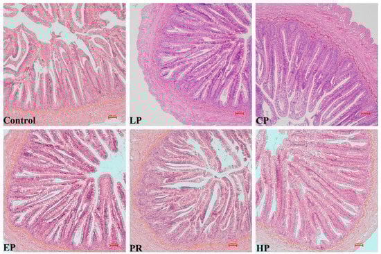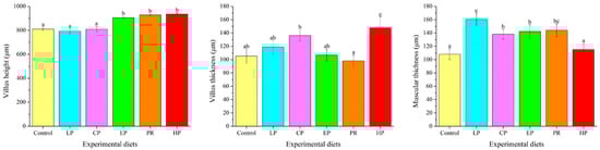 Examination of the intestinal morphology showed that villus height in the EP, PR and HP diet groups was remarkably higher than in the control, LP and CP diet groups (p < 0.05). The highest value of villus thickness was obtained in the HP diet group and was significantly higher than in the other diet groups (p < 0.05). Fish fed the LP, CP, EP and PR diets had higher mucosal thickness than those fed the control and HP diets (p < 0.05) (Figure 4).
