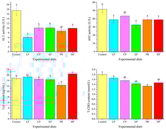 ALT activity and T-CHO levels in the astaxanthin-supplemented groups (LP, CP, EP, PR, and HP) were remarkably lower than in the control group (p < 0.05). Fish fed on the LP, EP, PR, and HP diets had lower AST activity than those fed on the control diet (p < 0.05). Compared with the control group, Lyz content was significantly enhanced by the HP diet and decreased by the PR diet (p < 0.05) (Figure 5).