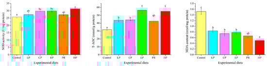 Antioxidant parameters were significantly affected by dietary astaxanthin (p < 0.05) (Figure 6). MDA levels in the livers of the astaxanthin-supplemented groups (LP, CP, EP, PR, and HP) were significantly lower than in the control group (p < 0.05). Fish fed on the CP, EP and HP diets had higher SOD activity than those fed on the control diet (p < 0.05), but there was no obvious difference from the control, LP and PR diets (p > 0.05). Except for PR, fish fed on the diets supplemented with astaxanthin (LP, CP, EP and HP) had significantly higher T-AOC values than those fed on the control diet (p < 0.05).