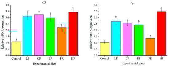 As depicted in Figure 8, mRNA levels of complement 3 (C3) in the astaxanthin-supplemented groups (LP, CP, EP, PR, and HP) were remarkably higher than in the control group (p < 0.05). Except for PR, mRNA levels of Lyz in the LP, CP, EP and HP diets were significantly higher than in the control group (p < 0.05).