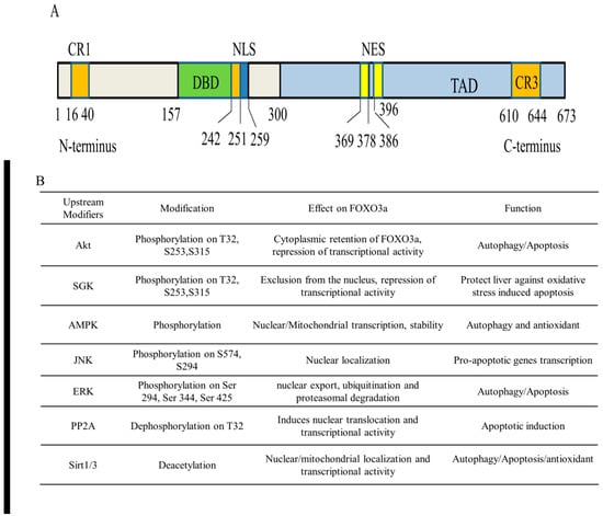 Forkhead box O (FOXO) transcription factors are members of the forkhead box (FOX) family that have a highly conserved forkhead DNA-binding domain (DBD) []. FOXO transcription factors have been discovered in several species, including the worm (daf-16), the fly (dFoxO), zebrafish, rodents, and humans []. To date, four key elements of the mammalian FOXO subfamily have been found, including FOXO1, FOXO3a, FOXO4, and FOXO6. These proteins have a high level of profile similarity and vary mainly in their tissue-specific expression []. FOXO3a has been investigated extensively as a special and crucial regulator of cellular homeostasis, lifespan, and stress response. FOXO3a is regarded as a crucial regulator of many essential cellular processes, including cell proliferation, apoptosis, autophagy, and ROS detoxification [,,,,]. FOXO3a’s subcellular distribution, protein–protein interactions, stability, and transcriptional selectivity may be influenced by ROS through post-translational modifications (PTMs) and epigenetic processes, as shown by accumulating data [,,]. In this review, the functions of FOXO3a were summarized with emphasis on the regulation of FOXO3a, including PTMs and epigenetic mechanisms upon oxidative stress, as well as the underlying molecular mechanisms regulating its activity and functions in chemical-induced liver oxidative injury. Targeted interventions of FOXO3a signaling may provide promising therapeutic approaches against liver oxidative injury.