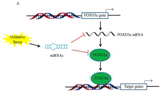 Recent evidence suggests that the epigenetic regulation of FOXO3a mainly includes microRNAs and histone modifications under oxidative stress conditions (Figure 3) [,]. MicroRNAs (miRNAs) have revealed new information on the function regulation of FOXO3a. Many miRNAs have been identified which directly or indirectly regulate FOXO3a. For instance, miR-155, miR-96, miR-223, and miR-21 are known to directly regulate FOXO3a, while miR-205 and miR-34a-5p regulate FOXO3a via the respective upstream targets, PTEN and Sirt3 [,,]. Furthermore, it has been revealed that miR-378 in FOXO3a-regulated autophagy is associated with the kinase Akt, which facilitates the removal of malfunctioning or injured mitochondria by targeting the expression of the Akt stimulator, PDK1 (phosphoinositide-dependent protein kinase 1) []. A miR-Akt-FOXO3a axis has also been revealed in the liver, where miR-205-5p stimulates Akt and suppresses FOXO3a in primary hepatocytes, ultimately decreasing glucose synthesis [].