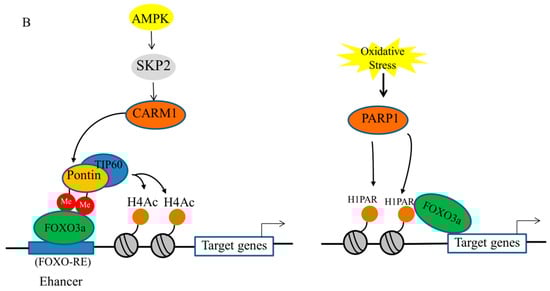 Histone changes have been shown to be associated with the regulation of FOXO3a transactivation during interactions with environmental factors. A recent study stated that FOXO3a is responsible for regulating autophagy gene expression by suppressing SKP2 to up-regulate CARM1 []. FOXO3a was recruited to the FOXO response element (RE) containing genes upon starvation, and then methylated Pontin and Tip60 were co-recruited via the arginine methyl-binding residues along with increased H4 acetylation; that is, the CARM1–Pontin–FOXO3a signaling axis acts as a stimulation enhancer to establish target gene regulation by increasing H4 acetylation. It is also probable that these arginine methyl-binding residues are accessible to other methylated FOXO3a regulators, enabling appropriate and fine-tuned responses to various environmental stressors. Intriguingly, since FOXO3a plays crucial roles in stress responses, the discovery of new links between FOXO3a and methylated partners will provide the path for cells to adapt to varied pressures in novel ways.