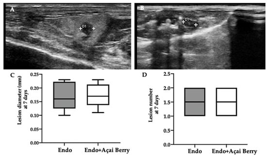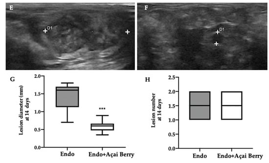 Ultrasonographic exams were employed to monitor the development of the pathology at seven and fourteen days from the induction. A pelvic ultrasound showed endometriotic-like lesions in the inner surface of the peritoneal cavity in both groups at seven days from the induction (Figure 1A,B). This analysis was conducted to control the establishment of the pathology before the Açai Berry administration. No differences were detected in diameter (Figure 1C) and lesions number (Figure 1D). After this control was applied, the Açai Berry was administered for the next 7 days. Fourteen days from the induction, the ultrasonographic exams showed that the Endo group had an increased lesion diameter (Figure 1E,G) as compared to the Endo + Açai Berry group (Figure 1F,G). The same number of lesions was detected in both groups (Figure 1H).