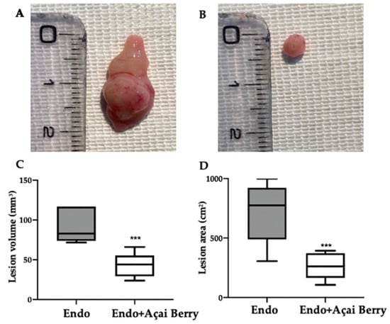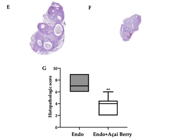 Fourteen days after the rats developed endometriosis, an induction laparotomy was performed in both groups and lesions were harvested. The macroscopic analysis (Figure 2A,B) was in line with the ultrasonographic exams. The endometriosis lesions collected from the Endo group showed a higher volume (Figure 2C) and area (Figure 2D) that than collected from the Endo + Açai Berry group. The histopathological analysis showed that the Açai Berry administration changed the lesion morphology. Lesions harvested from the Endo group presented characteristic glands and stroma (Figure 2E,G), while the Açai Berry administration reduced the histopathological score (Figure 2F,G).