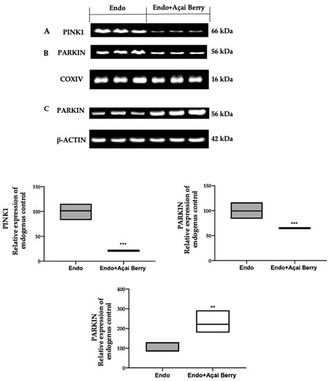 To investigate mitophagy induction, we investigated the cytoplasmic and mitochondrial expression of PINK1 and PARKIN. The samples collected from the Endo group showed elevated PINK1 (Figure 5A) and PARKIN (Figure 5B) expressions in the mitochondria, while Parkin expression was reduced in the cytosol (Figure 5C). The Açai Berry administration reduced PINK1 (Figure 5A) and PARKIN (Figure 5B) mitochondrial expressions, while the PARKIN cytoplasmic expression was increased (Figure 5C).