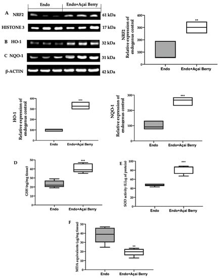 Analysis of Açai Berry administration on prooxidative alterations. Western blot analysis of NRF2 (A) nuclear expression, HO-1 (B) and NQO-1 (C) cytosolic expression, GSH levels (D), SOD activity (E) and MDA (F) levels. A p-value of less than 0.05 was considered significant. ** p < 0.01 vs. Endo, *** p < 0.001 vs. Endo.