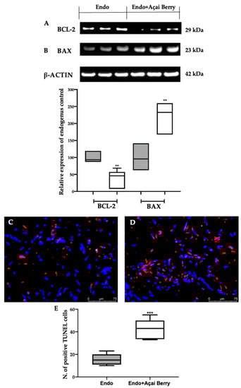 The samples collected from the Endo group showed an impaired apoptotic pathway (Figure 7). A Western blot analysis revealed an elevated BCL-2 (Figure 7A) and low BAX (Figure 7B) expression in the Endo group. The Endo + Açai Berry group showed a reduced BCL-2 (Figure 7A) and increased Bax (Figure 7B) expression. These results were confirmed with a TUNEL analysis where the number of TUNEL-positive cells strongly increased in the Endo + Açai Berry group (Figure 7D,E) as compared to the Endo group (Figure 7C,E).