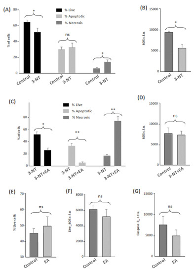 Percentages of live cells (Hoechst +), apoptotic cells (Caspase 3+) and necrotic cells (Ethidium homodimer +) on human enterocytes as affected by exposure to 200 μM 3-NT for 72 h compared to control counterparts (A). Relative fluorescence units (r.f.u.) of ROS occurrence (Cell Rox +) on human enterocytes as affected by exposure to 200 μM 3-NT for 72 h compared to control counterparts (B). Percentages of live cells (Hoechst +), apoptotic cells (Caspase 3+) and necrotic cells (Ethidium homodimer +) on differentiated human enterocytes as affected by exposure to 200 μM 3-NT+ 200 μM EA for 72 h compared to 200 μM 3-NT treated cells (C). Relative fluorescence units (r.f.u.) of ROS occurrence (Cell Rox +) on human enterocytes as affected by exposure to 200 μM 3-NT+ 200 μM EA for 72 h compared to control counterparts (D). Percentages of live cells (Hoechst +) (E), relative fluorescence units (r.f.u.) of ROS occurrence (Cell Rox +) (F) and relative fluorescence units (r.f.u.) of apoptotic events (Caspase 3+) (G) on human enterocytes as affected by exposure to 200 μM EA for 72 h compared to control counterparts. Results are expressed as means ± standard deviations. Asterisk on top of bars denote significant differences (* p < 0.05; ** p < 0.01) between paired group of samples (control vs. 3-NT; 3-NT vs. 3-NT). Ns: no significant differences.