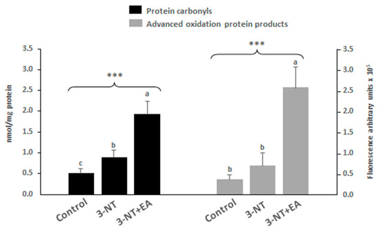 Protein carbonyls (nmol/mg protein of α-AS and γ-GS) (black bars) and advanced oxidation protein products (Pentosidine; fluorescence intensity) (grey bars) on differentiated human enterocytes upon exposure to 200 μM 3-NT and 200 μM 3-NT+200 μM EA for 72 h. Asterisks on top of bars denote significant differences between group of samples in ANOVA (*** p < 0.001). (a–c) Different letters on top of bars denote significant differences between means in post-hoc Tukey tests (p < 0.05).