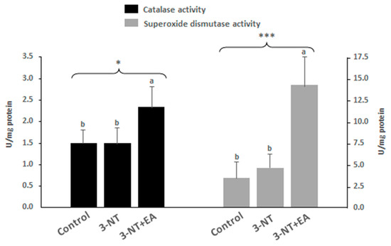 Antioxidant activity of catalase (black bars) and superoxide dismutase (grey bars) on differentiated human enterocytes upon exposure to 200 μM 3-NT and 200 μM 3-NT+200 μM EA for 72 h. Asterisks on top of bars denote significant differences between group of samples in ANOVA (* p<0.05; *** p < 0.001).(a–b) Different letters on top of bars denote significant differences between means in post-hoc Tukey tests (p < 0.05).