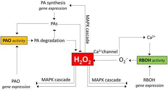 An outline of the pathways of how polyamine oxidase (PAO) and NADPH oxidase (RBOH) enzymes may influence each other’s activity. Both enzymes contribute to H2O2 generation. H2O2 may activate MAPK signalling, thereby leading to altered expression of the genes for any or both enzymes. The changes in gene expressions can either be positive or negative, depending on the context (see the text for examples). H2O2 can also activate genes involved in polyamine biosynthesis, and polyamines can serve as PAO substrates generating H2O2 or as H2O2 scavengers. H2O2 can also open Ca2+ channels, and the increased intracellular Ca2+ level augments the activity of the RBOH. Note that the various interactions are context-dependent, and several other ways of more indirect interactions may exist between the enzymes (e.g., via the activation of ROS-detoxifying mechanisms). PAO—polyamine oxidase; PAs—polyamines; MAPK—mitogen-activated protein kinase; RBOH—respiratory burst oxidase homolog (NADPH oxidase). The pointed arrows indicate the activation the round-pointed ones the inactivation.