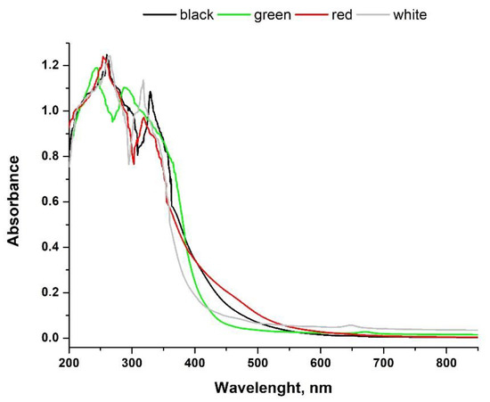 The absorbance spectra of studied tea infusions were recorded in a range of 200–850 nm, which is shown in Figure 1. According to the literature, such spectra can be the basis for distinguishing different kinds of tea [38,39,40]. Absorbance in the region from 250 to 350 nm is related to the η π electronic transition of methylxanthines and catechins, and specifically, these compounds can be used as chemical descriptors to distinguish black tea from green tea [39]. Other groups of compounds, which can be useful in the interpretation of tea spectra, are theaflavins and thearubigins, typical for black tea as a result of fermentation. Their presence in the infusion can be examined at 380 and 460 nm [40]. As can be seen in our spectra, black tea shows higher absorbance than green tea in the region of 250–400 nm but, on the other hand, the intensity of the absorbance is not significantly different from that obtained for red tea. In a range of 300–400 nm, green tea shows higher absorbance than red tea, which is consistent with literature data [38]. Additionally, green tea infusion presents the lowest absorbance, in the region 450–600 nm, which was also reported before [38].