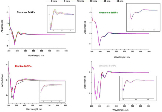 The synthesis of SeNPs was conducted parallel by the reduction of sodium selenite with a tea infusion. The excess of tea to selenium was 1:3. The changes in the UV-Vis spectrum were monitored from the beginning of the synthesis and then every 15 min until the hour, i.e., the end of the reaction. The recorded spectra are presented in Figure 2.