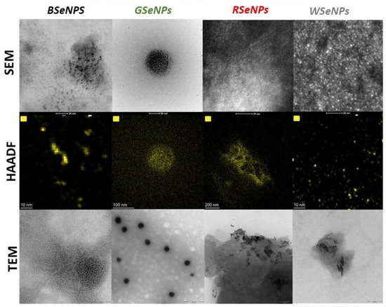 SEM, TEM and TEM (HAADF STEM) of obtained selenium nanoparticles. Abbreviations: BSeNPs—nanoparticles synthesized using black tea infusions, GSeNPs—green tea, RSeNPs—red tea and WSeNPs—white tea infusion.