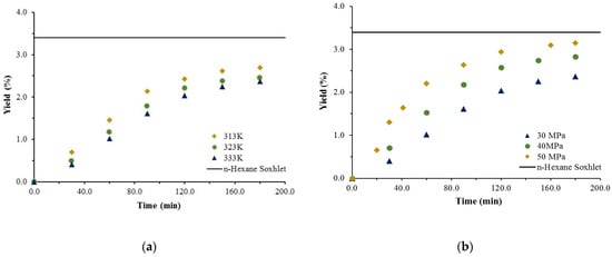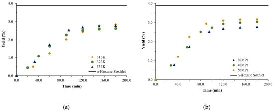 Cumulative experimental kinetic extraction curves plotted vs. the extraction time, at a scCO2 flow rate of 1.9 × 10−3 kg/min. Influence of temperature at a constant pressure of 30 MPa (a) and pressure at a constant temperature of 333 K (b) on the yield for G. viscosum flowers.