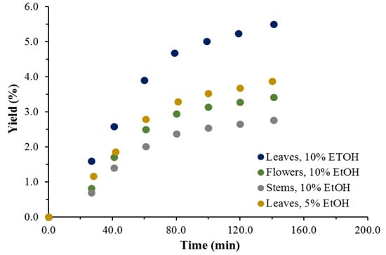 The scCO2 + ethanol extraction process was realized for approximately 30% less time than that required with neat CO2, at the same flowrate. Nevertheless, the yields achieved are still considerably lower than those of Soxhlet ethanol. For example, the highest yield for the leaves is approximately 3-fold lower than that of the latter but is obtained with a much lower amount of ethanol (only 10% in the composition of the solvent), and at a much shorter operation time. The scCO2 + ethanol yields are commensurable with Soxhlet ethyl acetate yields, e.g., 2.76 vs. 2.88% for the stems.
