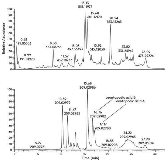 Quantitative analyses were performed for 3-O-caffeoylquinic (chlorogenic) and 5-O-caffeoylquinic (neo-chlorogenic) acids, and for the highly substituted glucaric acid derivatives leontopodic acids A and B, using standards available at the laboratory. The results obtained are based on external calibration and use of PRM in the negative mode of operation of the mass analyzer and are displayed in Table 2.