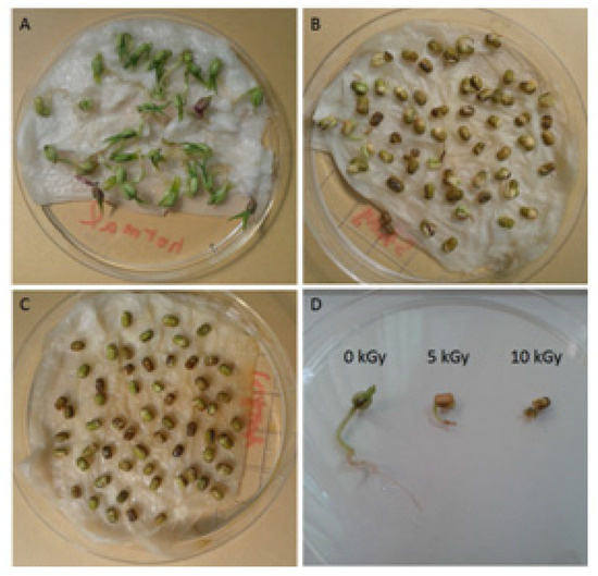 The phenotypic appearance of non-irradiated (0 kGy) and irradiated (5–10 kGy) mung beans. Seeds grown for four days without irradiation (A), with 5 kGy irradiation (B), or with 10 kGy irradiation (C) are shown in groups. For comparison, one seed from each condition is shown in parallel (D).