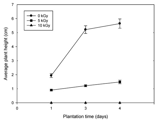 The changes in plant height under various doses of gamma-ray irradiation (mean ± standard deviation, N = 20/group).