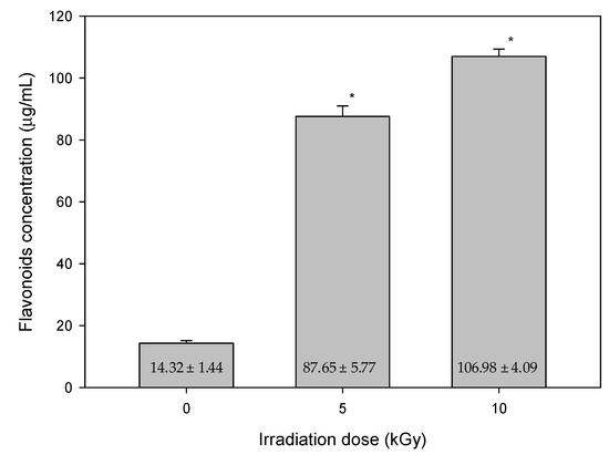 The measurements of total flavonoids of non-irradiated (0 kGy) and irradiated (5 or 10 kGy) mung beans. (mean ± standard deviation, * p < 0.001; N = 20/group).