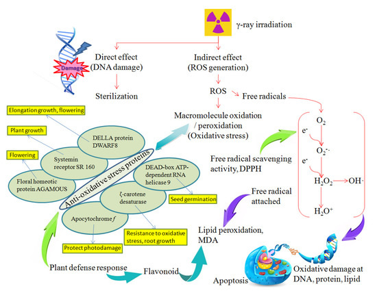 The effect of gamma-ray irradiation on the biological system of plant. Radiation can cause direct and indirect effects to DNA and proteins. For indirect effects, ROS are generated leading to increased oxidative stress and free radicals. In response to these radiation effects, flavonoid and anti-oxidative stress proteins are induced via this proposed mechanism.