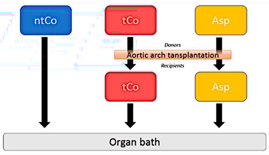 The applied experimental design. tCo: transplanted control group; Asp: Aspirin group; ntCo: non-transplanted control group.