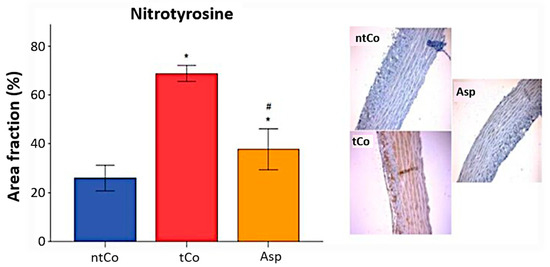 The level of oxidative stress in the vascular wall of the arterial graft was assessed by nitrotyrosine immunoreactivity, characterized by nitrotyrosine-3 positive area. The intensity of nitrotyrosine staining in the tCo (69 ± 1%) and Asp (38 ± 3%) groups was enhanced compared to the ntCo (26 ± 2%) (p < 0.05), but Asp significantly decreased the level of nitro-oxidative stress compared to the tCo (p < 0.05) (Figure 3).