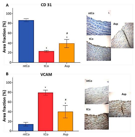 The inner walls of the aortic segment in the non-transplanted control group showed 87 ± 1% CD-31 positive endothelium area, demonstrating a high area of uninjured endothelium, whereas it was significantly decreased in the tCo (23 ± 1%) and Asp (39 ± 3%) groups (p < 0.05). The CD-31 positive reaction was significantly higher in the Asp group than in the tCo group (p < 0.05) (Figure 5A). Immunohistochemical staining revealed a high VCAM-1 positive endothelium area, which leads to a more pronounced leukocyte invasion in the tCo (79 ± 2%) and Asp groups (40 ± 5%), as opposed to the ntCo (14 ± 2%) (p < 0.05), however, VCAM-1 scores decreased significantly in the Asp group compared to the tCo group (p < 0.05) (Figure 5B).