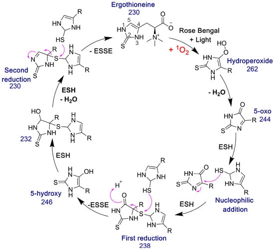 - Oumari, M.; Goldfuss, B.; Sto, C.; Schmalz, H.; Gründemann, D. Regeneration of ergothioneine after reaction with singlet oxygen. Free Radic. Biol. Med. 2009, 134, 498–504. [Google Scholar] [CrossRef]