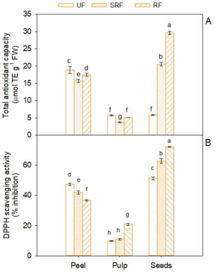 Costanzo, G.; Vitale, E.; Iesce, M.R.; Naviglio, D.; Amoresano, A.; Fontanarosa, C.; Spinelli, M.; Ciaravolo, M.; Arena, C. Antioxidant Properties of Pulp, Peel and Seeds of Phlegrean Mandarin (Citrus reticulata Blanco) at Different Stages of Fruit Ripening. Antioxidants 2022, 11, 187. https://doi.org/10.3390/antiox11020187