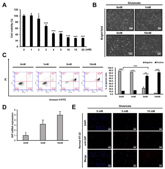 Effects of glutamate-induced neuronal cell death in mouse hippocampal HT-22 cells. (A) The viability of HT-22 cells treated with the indicated concentrations of glutamate for 24 h was measured by the CCK-8 assay. (B) Images of HT-22 cell morphologies were obtained using a microscope. Magnified images of cells treated with 0, 1, 5, and 10 mM glutamate for 24 h. (C) The damage caused by glutamate-induced neuronal toxicity under the indicated glutamate treatment conditions. The number of cells stained with annexin V–PI after glutamate treatment was assessed by flow cytometry according to our gating line (left) and the normalised percentage of gained cells that died by excessive glutamate (right) in HT-22 cells. (D,E) HT-22 cells were treated with the indicated concentrations of glutamate to verify the basal level of GIP. Following this, the mRNA (D) and protein (E) levels of GIP were evaluated using qPCR and immunofluorescence assays, respectively. Red fluorescent protein fluorescence was observed to determine the basal level of GIP in normal HT-22 cells. * p < 0.05, ** p < 0.01 and *** p < 0.001 compared with the corresponding untreated control.
