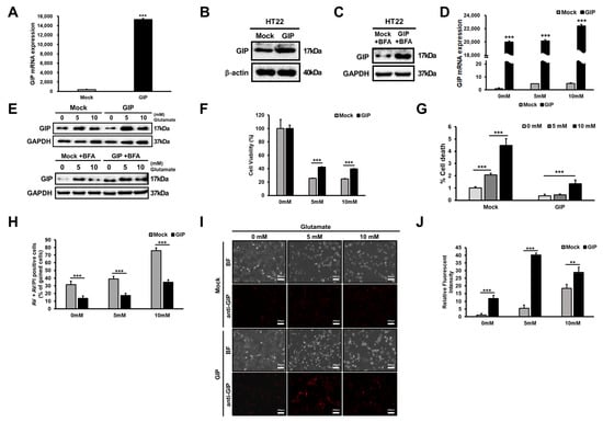 Increase in GIP expression upon glutamate treatment enhances neuronal HT-22 cell viability. (A) GIP mRNA expression levels were determined by qRT-PCR after establishing GIP-overexpressing HT-22 cells. Western blot analysis of GIP protein levels under normal conditions (B) and after treatment with BFA for 3 h (C). (D) GIP mRNA expression levels were checked upon treatment with the indicated concentrations of glutamate by qRT-PCR. The graph shows the expression level of GIP relative to that of GAPDH. (E) Western blot analysis of GIP protein levels. The cells were treated with different concentrations of glutamate (6 h) after treatment with BFA (3 h) or not. (F) The CCK-8 assay was performed to compare the cell viability between mock and GIP-overexpressing HT-22 cells after glutamate treatment (24 h) (same as previous data). (G) Effect of glutamate-induced cell death was determined by PI staining. (H) The degree of glutamate-induced cell death was evaluated by counting the number of double positive-stained cells by flow cytometric analysis. (I) HT-22 cells were incubated with glutamate in each group for 24 h. GIP expression was observed using antibodies for immunofluorescence assays, and bright field images were captured using a phase-contrast microscope (magnification, 20×). (J) The relative fluorescence intensity of GIP in the cell images was measured using ImageJ. Data are presented as the means ± SDs (n = 3). ** p < 0.01 and *** p < 0.001.