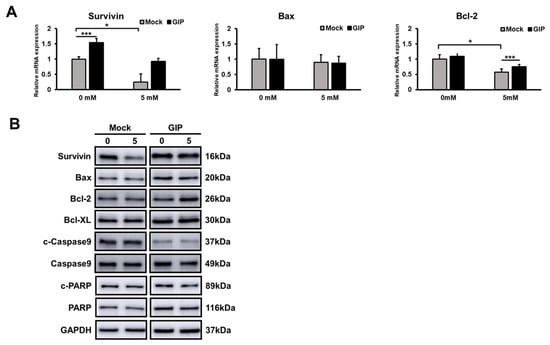 Interestingly, the expression and activation patterns of apoptotic markers were not consistent with the well-defined features of apoptosis under normal conditions. Accordingly, we investigated whether glutamate treatment could alter the levels of apoptotic markers in the control group. However, increased neuronal damage following glutamate treatment did not also cause apoptotic marker activation in the mock group. The mRNA levels of Bax, an apoptosis activator, did not differ significantly between the mock and GIP-overexpressing HT-22 groups (Figure 3A). Meanwhile, after treatment with 5 mM glutamate, the mRNA levels of antiapoptotic markers (Bcl-2), which were decreased in the 5 mM glutamate-treated group, were definitely higher in the GIP-overexpressing HT-22 cells than in the mock group (Figure 3A). The Bcl-2 protein level in mock HT-22 cells did not change even after glutamate treatment; however, it increased in GIP-overexpressing HT-22 cells. It may be a worthwhile consideration to maintain homeostasis and the recovery system.