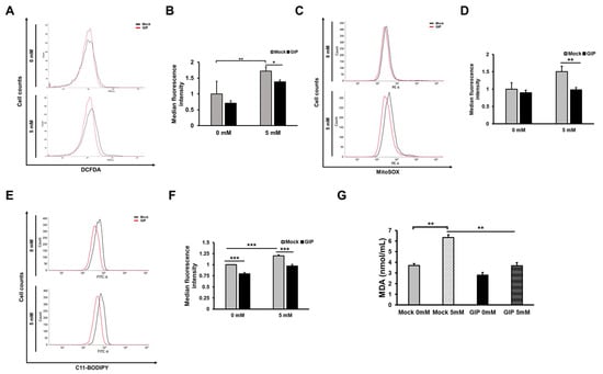Glutamate-induced oxidative stress is associated with the dysregulation of mitochondrial function and a series of processes that consequently cause cell death in many neurodegenerative diseases []. To further examine how GIP improves cell viability in the presence of glutamate-induced damage regardless of apoptosis, we assessed the effects of GIP on cellular ROS levels, which cause oxidative stress and mitochondrial dysfunction []. Excessive glutamate results in ROS accumulation and lipid peroxidation, which could be critical factors for glutamate-induced neuronal damage [,]. Initially, we measured intracellular ROS levels by flow cytometry with CM-H2DCFDA staining. Compared with the control, the levels of intracellular ROS induced by treatment with 5 mM glutamate were attenuated in GIP-overexpressing HT-22 cells (Figure 4A,B). This indicates that GIP effectively inhibits glutamate-induced intracellular ROS production. In addition, we analysed mitochondrial ROS production and lipid peroxidation, which are known as ferroptosis phenomena []. As expected, the overexpression of GIP reduced the glutamate-mediated production of mitochondrial ROS and lipid peroxidation. MitoSOX and C11-BODIPY were used to detect mitochondrial ROS production (Figure 4C,D) and lipid peroxidation (Figure 4E,F), respectively. Since we observed the lipid peroxidation was changed in glutamate, we examined whether glutamate influences malondialdehyde (MDA), a lipid peroxidation marker, also measured (Figure 4G). As a result, MDA level increased by about two times when glutamate was treated in the mock group, whereas in the GIP-overexpressing group, MDA expression was lower than in the mock from the basic state without glutamate and showed a slight increase even when glutamate was treated. GIP-overexpressing HT-22 cells showed reduced lipid peroxidation in the absence of glutamate; the distinction became remarkable in the presence of excessive glutamate. These results indicate that excessive glutamate induces detrimental oxidative stress, e.g., ferroptosis in neurons and that GIP helps decrease ferroptosis by suppressing ROS production and subsequent lipid peroxidation.