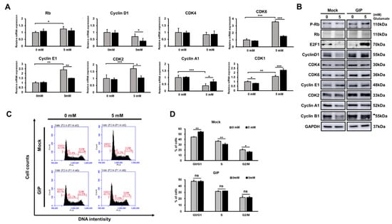 To clarify the cell state under glutamate-induced neuronal cell damage conditions, we assessed the effect of glutamate treatment on the progression of the cell cycle through propidium iodide (PI) staining and measured the mRNA and protein levels of cell cycle-related factors. In particular, the mRNA expression levels of cyclin E1, cdk6 and cdk2 increased and that of cyclin A1 decreased after treatment with 5 mM glutamate in the control (Figure 5A). In addition, the protein levels of cyclin D1, A1 and B1 decreased, while cyclin E1 was accumulated in the mock group after treatment with 5 mM glutamate (Figure 5B). Most GIP-overexpressing HT-22 cells did not show any remarkable cell cycle arrest at specific points, even after glutamate treatment. Compared with the control, most GIP-overexpressing HT-22 cells showed higher basal protein levels of the indicated cell cycle-related factors. Furthermore, those two groups had a different tendency in terms of E2F transcription factor 1 (E2F1) and phospho-Rb (p-Rb) (Figure 5B). p-Rb combines with E2F factors and blocks their ability to facilitate the expression of genes that encode products responsible for S-phase progression []. Under normal conditions, GIP-overexpressing HT-22 cells showed lower E2F1 expression levels than the control; however, the opposite result was observed after treatment with 5 mM glutamate. Hence, we scrutinised the cell cycle phase by flow cytometric analysis with PI staining. An increase in the proportion of the G1 phase and a decrease in the S and G2/M phases were noted in 5 mM glutamate-treated vehicle HT-22 cells. These results imply that the stress induced by excessive glutamate causes G1/S arrest in HT-22 cells. In contrast, the cell cycle of GIP-overexpressing HT-22 cells was not affected by glutamate treatment (Figure 5C, 5D). The cell cycle arrest in glutamate-induced HT-22 cell death was not affected by GIP overexpression. The results suggest that GIP alleviates neuronal damage caused by excessive glutamate, which is involved in G1/S cell cycle arrest. As shown in Figure 4 and Figure 5, ROS accumulation could have resulted in G1/S arrest or vice versa []. The results proved that GIP inhibits G1/S arrest by lowering ROS levels under glutamate-induced neuronal toxicity conditions.