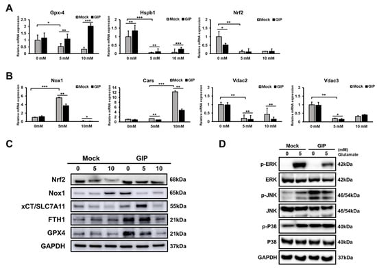 GIP reduces glutamate-induced ferroptosis and MAPK activation. (A,B) Transfectants were treated with the indicated concentrations of glutamate for 6 h, and then, mRNA levels of positive (A) and negative markers (B) of ferroptosis were assessed by qRT-PCR. (C) Western blot analysis was preformed to detect anti-ferroptosis factors in mock and GIP-overexpressing HT-22 cells. All samples were treated with the indicated glutamate concentrations (5 and 10 mM) for 6 h and then analysed. (D) The cells were treated with 5 mM or without glutamate for 9 h and the phosphorylation and total protein levels of MAPKs in each group were assessed by Western blotting. Data are presented as the means ± SDs (n = 3). * p < 0.05, ** p < 0.01 and *** p < 0.001.