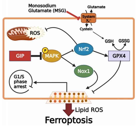 Schematic depicting the regulation of Nrf2 and Nox1 by GIP during glutamate-induced ferroptosis in HT-22 cells. Excessive glutamate inactivates GPX4 function to induce lipid ROS accumulation. Overexpression of GIP attenuates ferroptosis by regulating Nrf2 and Nox1 ferroptosis factor through MAPK signal pathway. G1/S phase arrest induced by ferroptosis can be normalised in GIP-overexpressing HT-22 cells.